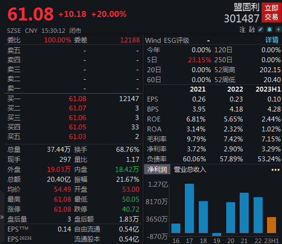 8月17日,盟固利涨停,股价报61.08元,成交额20.40亿元,换手率68.76%。该股已连续两个交易日涨停。