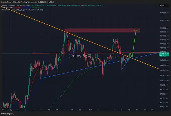 BTC 橙色趋势线之下看跌的剧本暂时否定了,小级别如果继续守在 105500 之上,是要扫区间上极限流动性的节奏。继续关注橙色趋势线的支撑情况。目前压力位变成了支撑位。