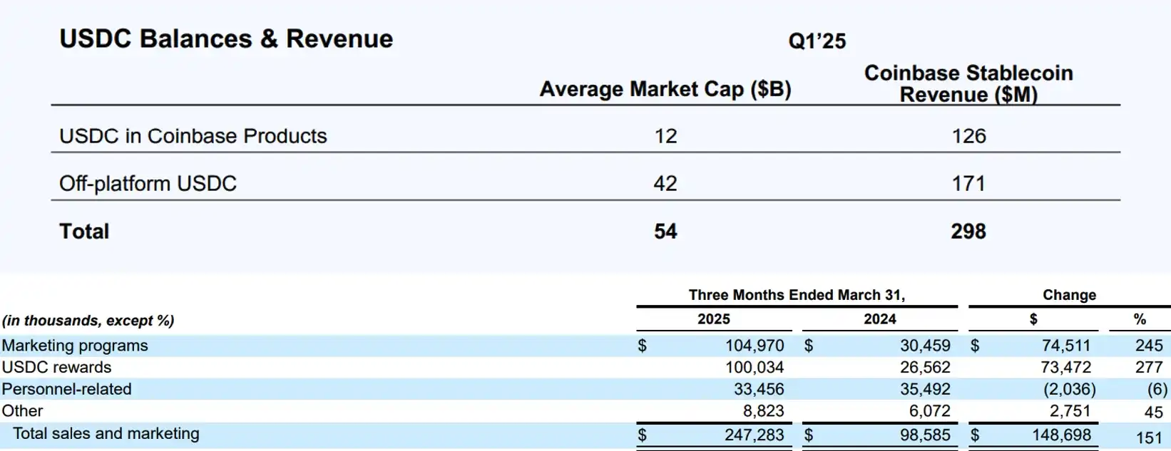 Coinbase 稳定币收入分配和 Coinbase 营销成本结构。资料来源:Coinbase 2025 年第一季度财报