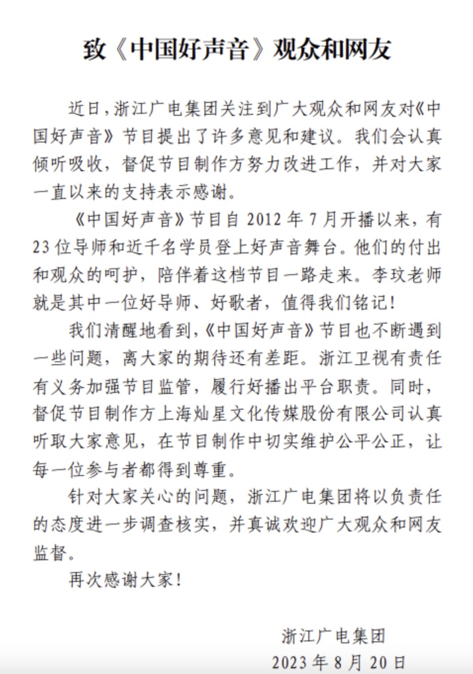 浙江广电集团在回应中表示,关注到广大观众和网友对《中国好声音》节目提出了许多意见和建议。会认真倾听吸收,督促节目制作方努力改进工作,并对大家一直以来的支持表示感谢。
