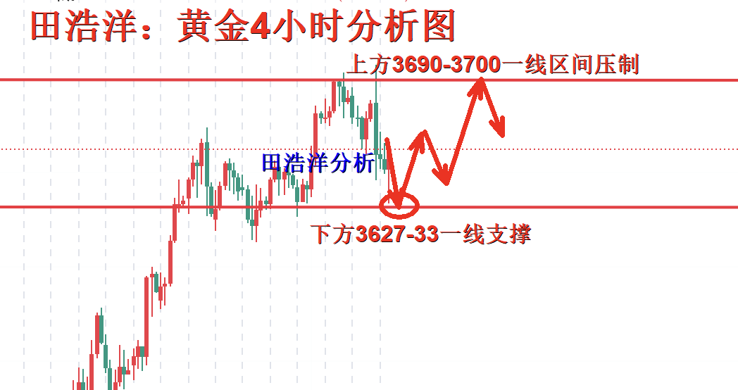 从4小时分析来看,下方的有效支撑则维持于3627-30附近区域,此区域也是目前重点防御支撑位,而一旦此位置继续失守的话,则后期多空将有可能转换,而上方的重点压力则维持于3690-3700一线,操作上以此区间进行多空布局,中间位置一律多看少动谨慎追单,耐心等待关键点位进场。具体操作策略我会在盘中提示,及时关注。