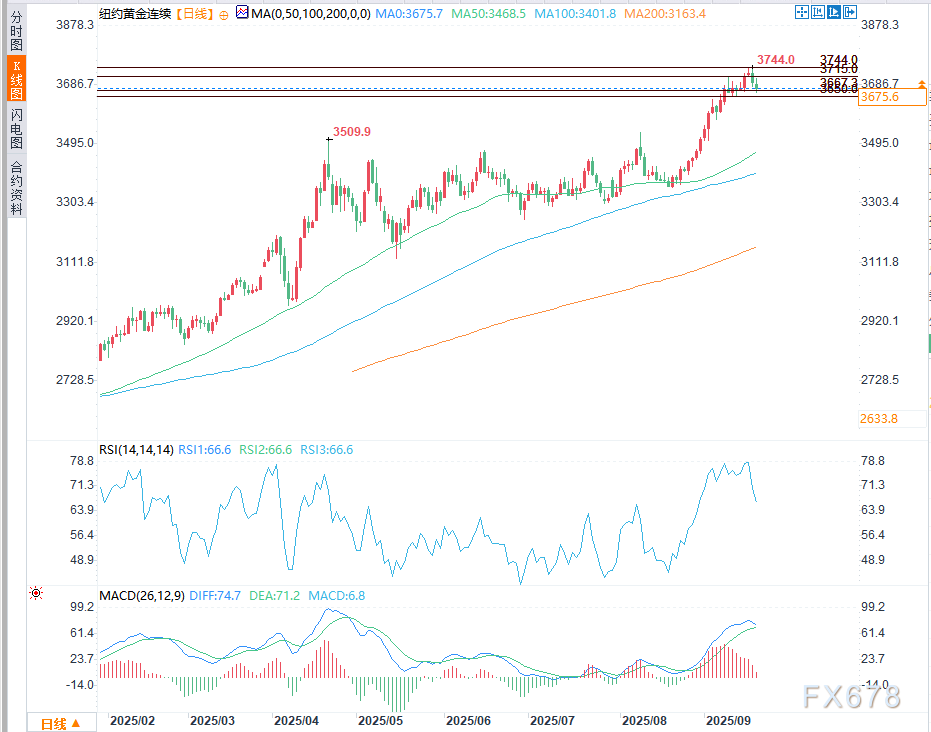 从技术角度来看,12月黄金期货多头在整体近期技术面具有稳固优势。多头的下一个上行价格目标是收盘价高于3800.00美元的强劲阻力位。空头的下一个近期下行价格目标是将期货价格推低至3600.00美元的强劲技术支撑位下方。第一阻力位看3715.00美元,然后是本周高点3744.00美元。第一支撑位看隔夜低点3667.30美元,然后是3650.00美元。