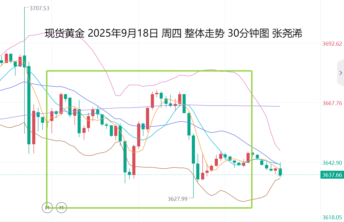 上交易日周四(9月18日):国际黄金整体走势震荡收跌,短期风险偏弱调整走低。走势自亚市开于3659.80美元/盎司,于欧盘时段录得日内高点3672.90美元,并又在美盘开盘后连续跳水录得日内低点3627.82美元,最终有所止跌回升陷入震荡,收于3644.22美元,日振幅45.08美元,收跌15.58美元,跌幅0.43%。