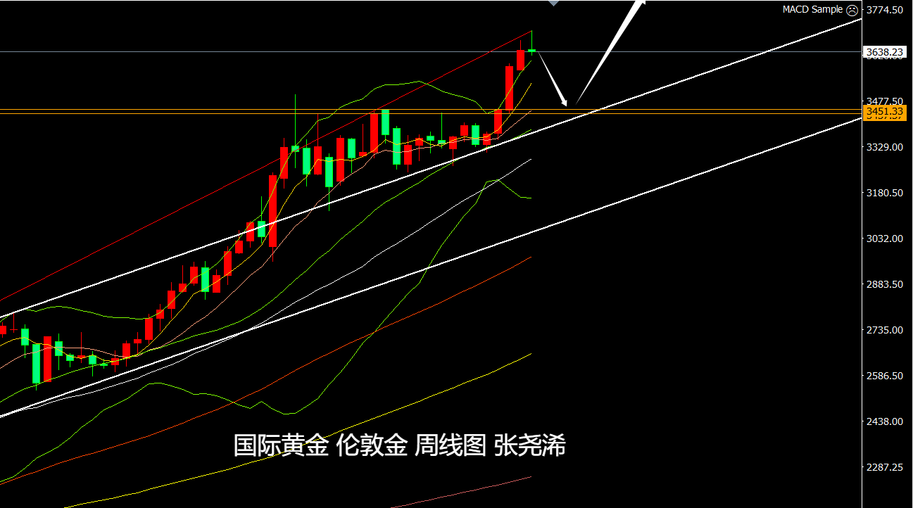 周图,金价自去年开涨攀升以来,如期第4次再度回踩中轨线支撑,并再度向上攀升,且不断触及给出的看涨目标位,虽然目前多头动力减弱,有回撤走低的需求,但由于低点不断上移,整体又运行的在之前的上行通道上方,故此,如有较大的回调,关注之前的上升通道支撑,以及中轨线支撑,也可是为再度回踩的看涨机会。