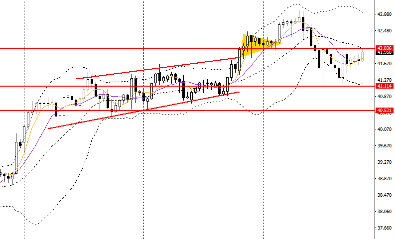 白银探底回升,徘徊于10日均线附近,4小时上探42关口压力,如承压于下方可维持高空思路,下方继续关注41关口支撑,如继续下破,可下看至40.80,40.50。