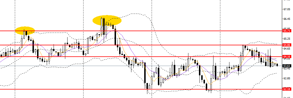 美原油收十字阴线,仍承压于64关口,4小时一度刺破64,但多头动能再度减弱,空单仍可持有,后市预计将维持震荡下行。