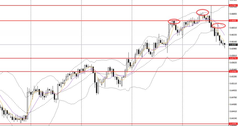 澳美重幅受挫,承压于10日均线,4小时呈复杂头肩顶,空单仍可持有,短线大概率延续跌势,如彻底下破0.66,则有望下探0.6570附近。