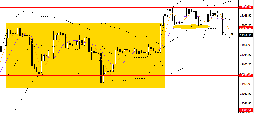 A50大幅走低,下破15000大关,日线RSI拐头下行,15200附近仍面临强压,如继续承压于15000下方,空单可继续持有,后市可看空至14800,14600。
