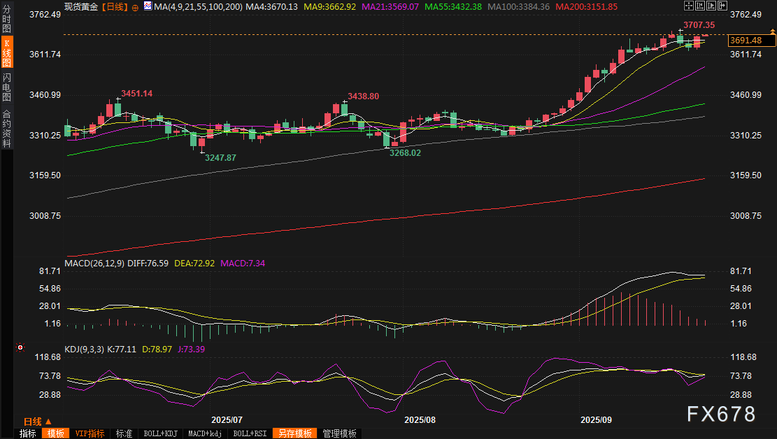 汇通财经APP讯——周一(9月22日)亚市早盘,现货黄金震荡微涨,目前交投于3691.78美元/盎司。上周全球黄金市场再度迎来里程碑时刻。上周三(9月17日)美联储宣布降息25个基点后,现货黄金价格一度冲至3707.40美元/盎司的历史新高,尽管随后出现震荡回调,但上周五收盘仍站稳3684.93美元,周线涨幅达1.15%,实现连续第五周上涨。这一表现凸显黄金在货币政策转向初期的韧性。