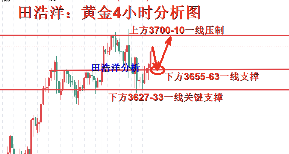 从4小时分析来看,下方的有效支撑则维持于3655-64附近区域,上方的重点压力则维持于3700-3710区间一线,操作上以回踩做多为主,中间位置一律多看少动谨慎追单,耐心等待关键点位进场。具体操作策略我会在盘中提示,及时关注。