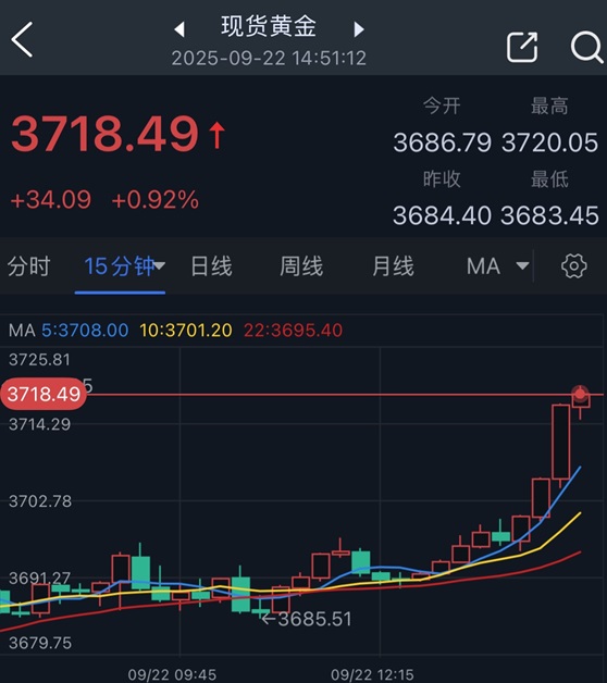 24K99讯 周一(9月22日)亚市尾盘,现货黄金短线突然大幅攀升,金价刚刚触及3720.05美元/盎司,刷新历史新高;目前金价位于这一水平附近,日内大涨近35美元。FXStreet高级分析师Dhwani Mehta撰文,对金价走势进行分析。