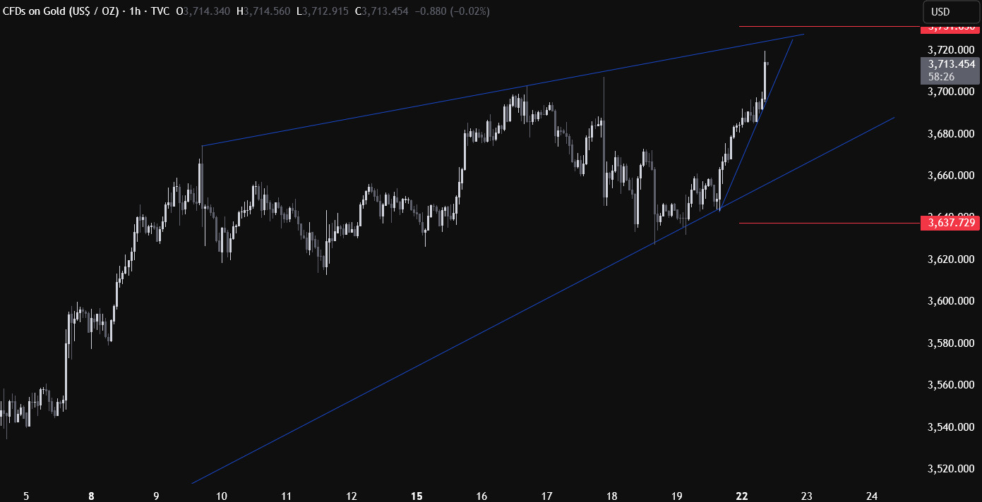 1小时图显示,顶部趋势线在3723一带,可能充当阻力。卖方很可能在该水平附近介入,并将止损设在趋势线上方,以博取回调至次要上行趋势线的机会。买方则希望看到价格突破上方趋势线,以加大看涨押注并推动金价再创新高。不过,考虑到目前价格已接近当日平均波动区间的上限,今天再度上破的可能性不大。