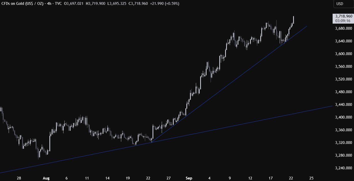 截至发稿,现货黄金上涨1%,至3722美元,盘中一度创下3726.54美元的新纪录高位。