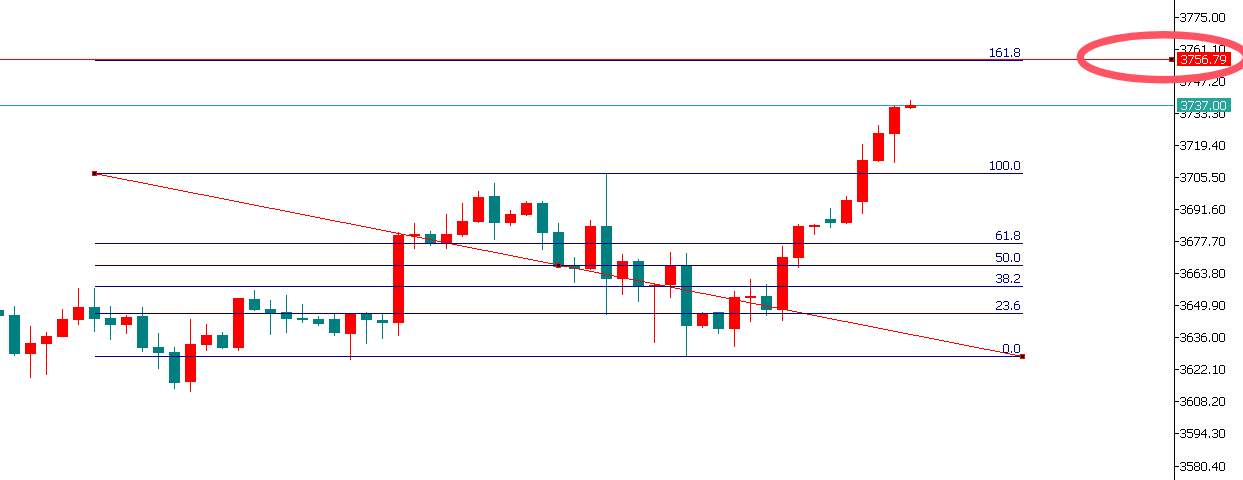 从黄金小时图来看,预期接下来继续冲击3757一线,也就是3628-3707向上延伸161.8%位置!!!