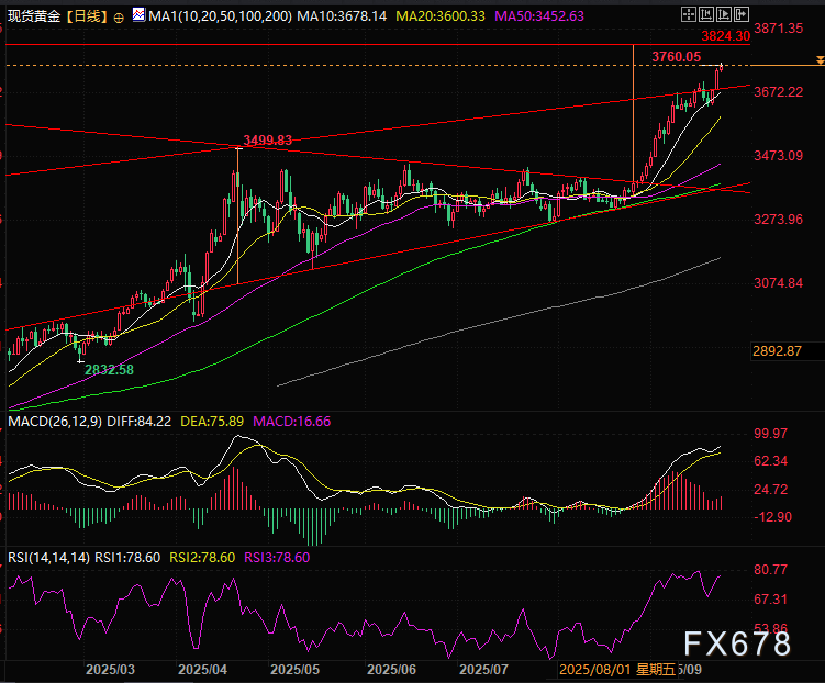 周二亚欧时段现货黄金价格表现强势,早盘在20美金振幅内震荡上行,目前快速上涨至0.59%,交投于3769美元/盎司,周一金价上涨近2%创下历史新高,主要是受美国进一步降息预期升温,以及政治不确定性下避险需求持续的推动所致。