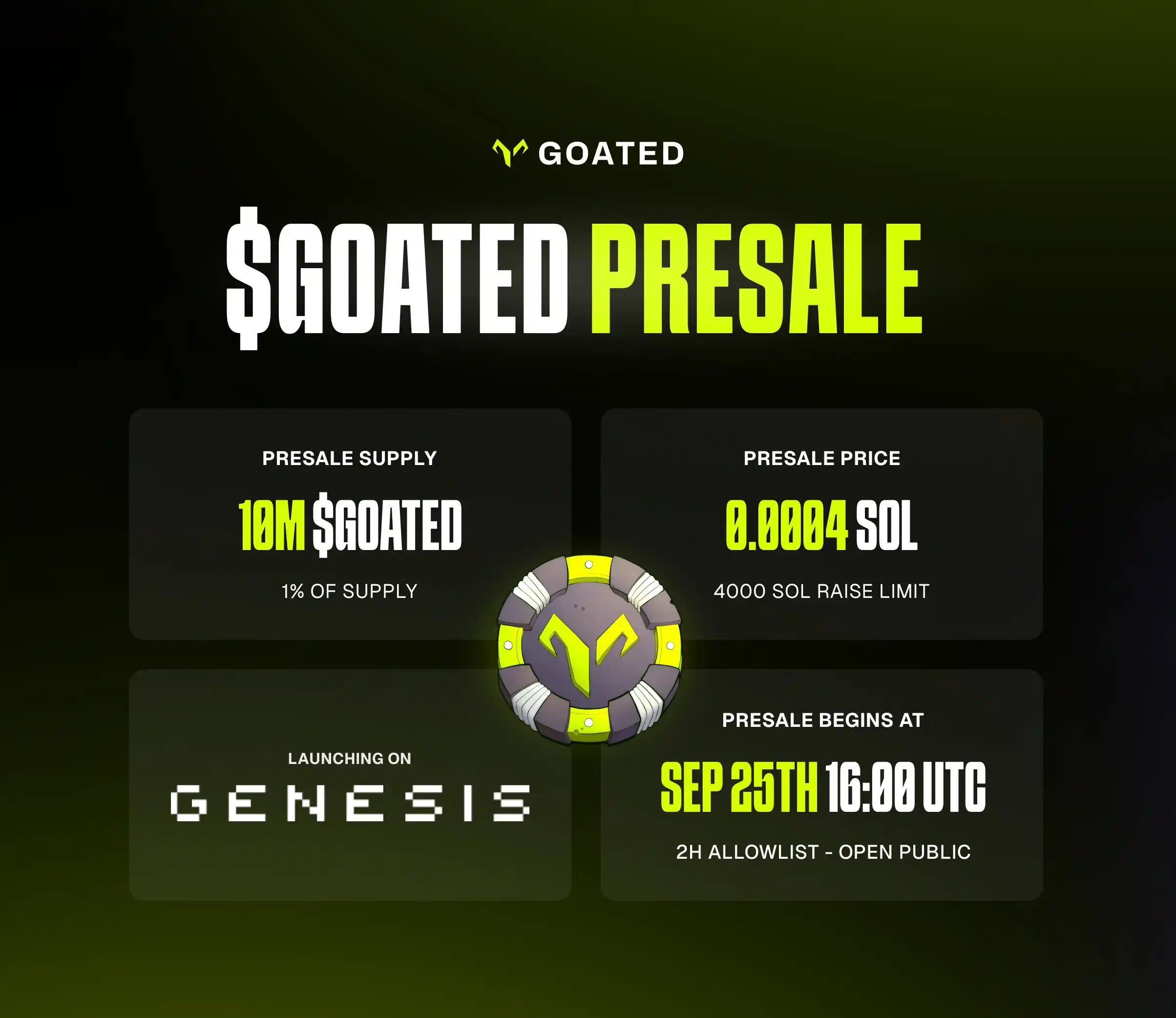 这次预售采用固定价格公开发售模式,预售将于 9 月 25 日 16:00 UTC 开放,前 2 小时为社区允许名单(Allowlist)专场,随后向公众开放参与。本次将发行 1000 万枚$GOATED 代币(占总供应量 1%),价格为 0.0004 SOL/枚。募集上限为 4000 SOL(约合 88 万美元),达到上限则停止认购。