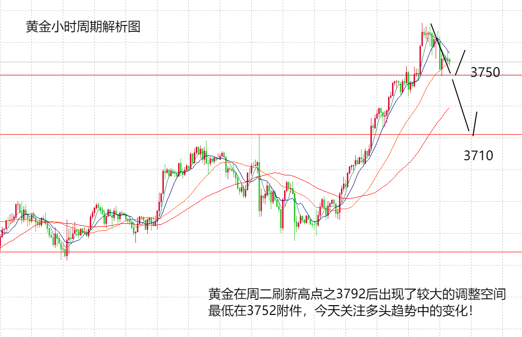 对于日内行情而言,继续保持看涨不追涨,回落做多,不猜顶原则即可。在周二出现极限上涨至3792后,午夜走出了较大力度的调整,最低在3752,这40美金的下跌并没有改变暂时黄金的多头趋势,目前顶多说明黄金可能会是一个高位震荡,所以,周二保持低多原则不变,看3800关口是否破位。技术面来看,目前k线收在布林上轨之下,有可能会在周三,周四出现连续调整后收口,所以,目前看涨明显,但不要过分看涨,可能会在调整中出现中期的调整力度,大家注意这有点即可。下方的强势支撑在3715,只要不破这一点,黄金难以出现强弱转换。H4周期出现了高位三连阴的表现,改变了之前连续收阳出新高的表现,这个表现可能会是本周见顶的信号,如果周三连续回落的话,那么,中期见顶,下方就有可能会去3715甚至更低,但如果周三继续收高,破坏这种连阴的话,多头再次爆发,未来市场还有有新高的可能。整体来说,虽然黄金短期内有中期调整的风险,但只要没有明确见顶,就尽量的以低多为主。小周期日内的支撑在3750,3715两个支撑点去做多,上方则关注3800关口的得失。