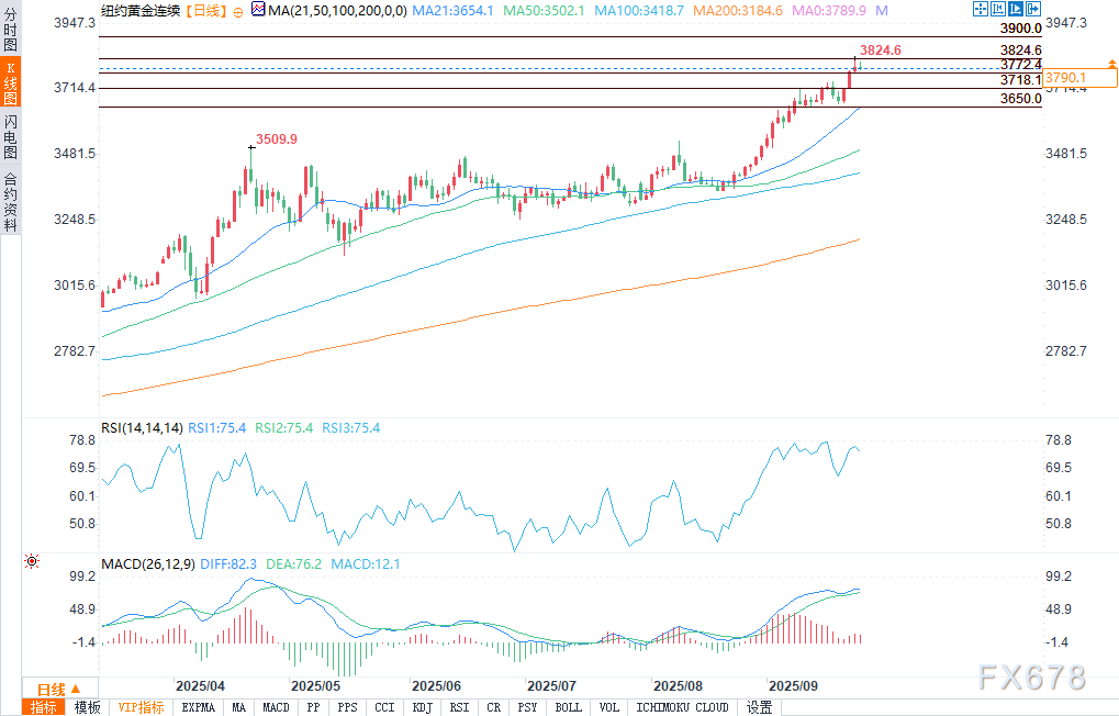 从技术面来看,12月黄金期货多头在近期整体技术面占据明显优势。多头的下一个上行价格目标是推动期货收盘价突破3900.00美元的关键阻力位。空头的下一个近期下行价格目标是将期货价格压至3650.00美元的关键技术支撑位下方。第一阻力位见于本周高点3824.60美元,进一步阻力位为3850.00美元;第一支撑位见于周二低点3772.40美元,进一步支撑位为本周低点3718.10美元。