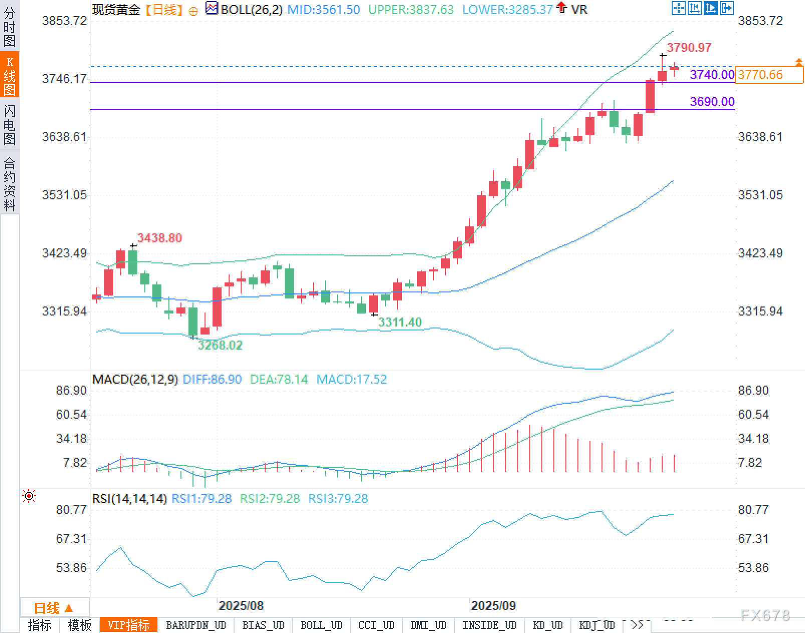 日线图呈现加速上行后的高位盘整特征。布林带显著开口,价格沿上轨上行并多次贴轨,当前上轨位于3837.63美元,中轨3561.50美元,下轨3285.37美元,说明波动率扩张未结束。价格已有效站上前期3740与3690两道线,前者转化为短线关键支撑,后者构成趋势防守位。