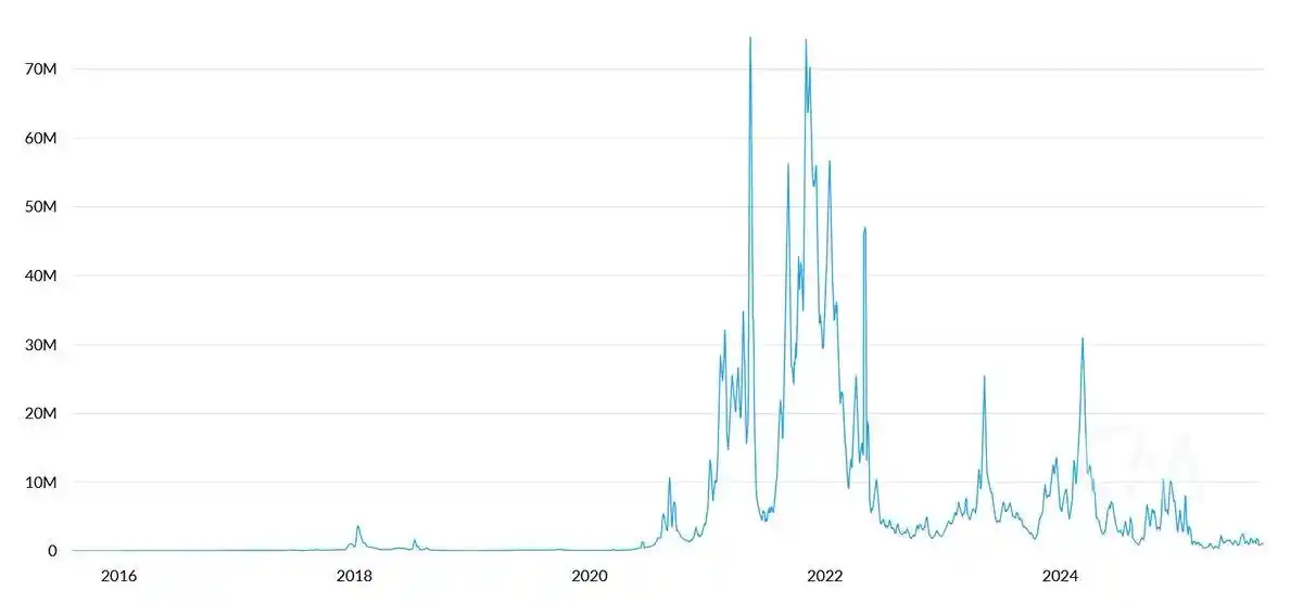 Tom Lee 的论点认为:稳定币和资产代币化活动增加会推高交易量,从而提升 ETH 的手续费收入。表面看似合理,但只要花几分钟查阅数据就会发现事实并非如此。