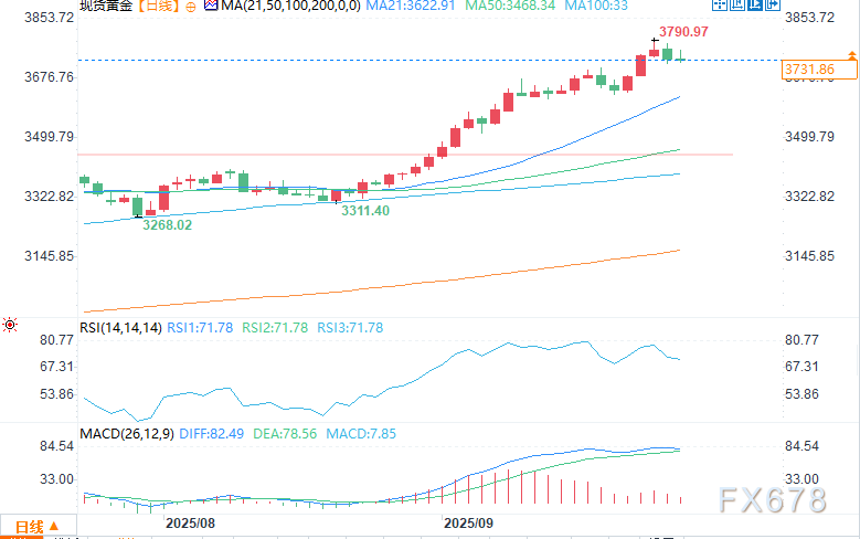 周二早间黄金价格曾攀升至每盎司3800美元关口附近,隔夜最高触及每盎司3779.34美元,但在北美交易时段全天持续回落。