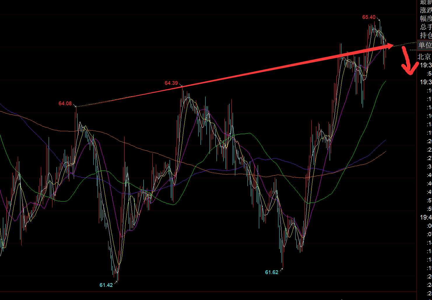 原油方面:日线近期大的震荡区间范围是66-61,未走出之前,还存在反复震荡走法;从上图短周期看,昨日提及的趋势阻力线是压制了一波,但空间不大,只给到64.1一线;当前又有所冲高回落于此线之下,留意65得失,站不上,就要小心冲高回落,小时线macd也存在顶背离,拉高是容易回踩的;