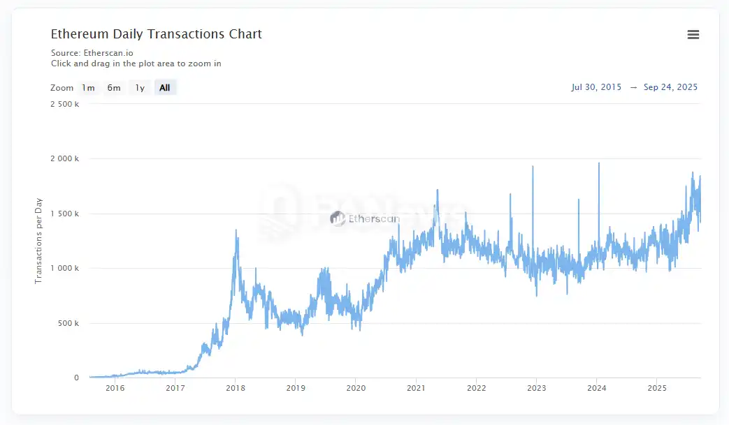 以太坊主网虽然现在在链上的动态并不明显,但在数据方面也有着较为明显的提升。以日交易笔数数据为例,整个 2024 年,以太坊网络日交易笔数基本维持在 100 万笔左右。而在 2025 年 4 月之后,这个数据开始明显爬升,目前的数据基本维持在 150 万到 180 万笔之间,已经是以太坊历史最高水平。