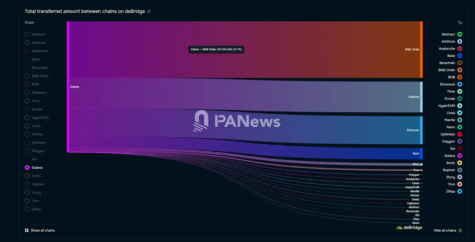 资金流动方面,近一周内 BSC 的净流入资金约为 7350 万美元,是流入资金量第三的公链。从 deBridge 的数据来看,流入主要来自 Solana、Arbitrum 和以太坊主网。