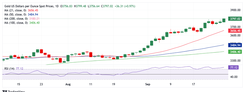 24K99讯 周一(9月29日)亚市盘中,现货黄金延续日内强劲涨势,金价刚刚突破3800美元/盎司大关,日内暴涨近48美元。FXStreet高级分析师Dhwani Mehta撰文,对金价技术走势进行分析。