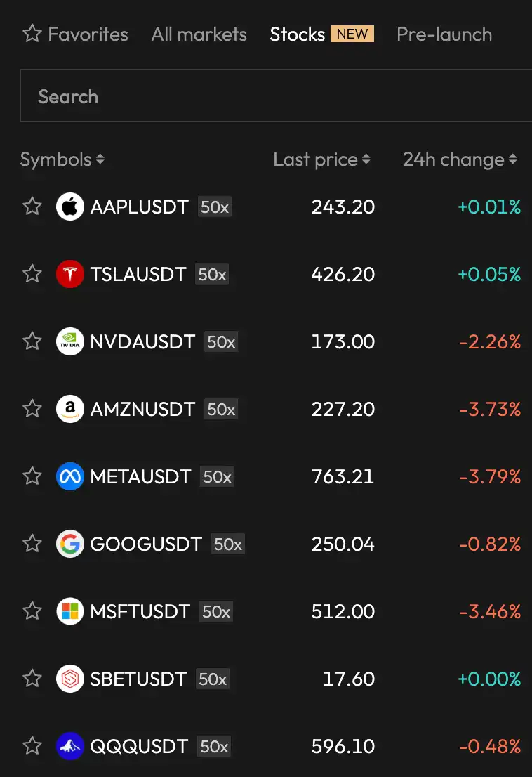 在主流 Perp DEX 里,Aster 是目前唯一提供股票交易的平台。
