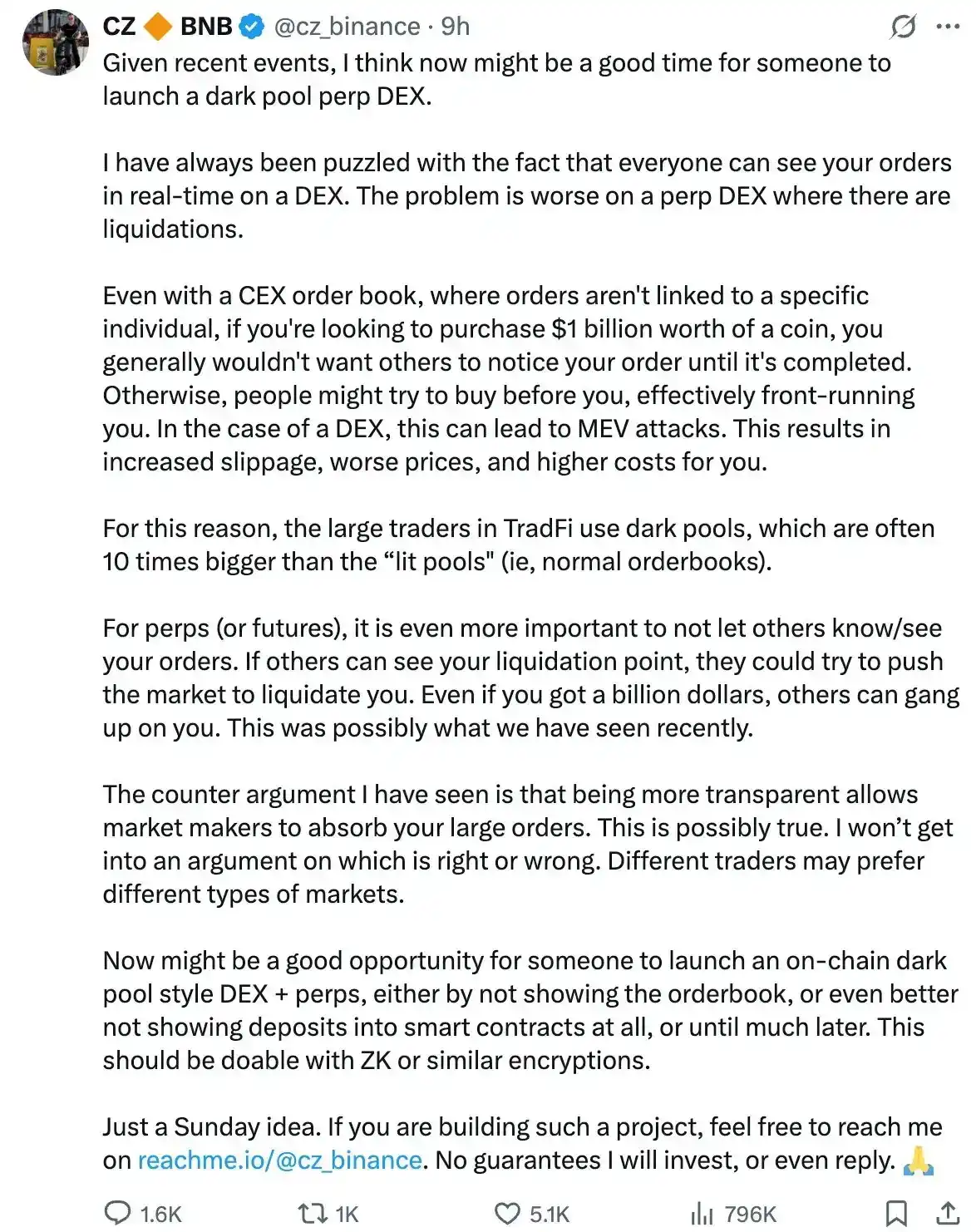 6 月 1 日,CZ 发布了一篇关于暗池的推文,提议「现在或许是推出暗池 perp dex 的好时机」,并指出 DEX 实时公开订单的透明性反而可能会导致 MEV 攻击,从而损害交易者的利益。CZ 的话题快速引发了市场关于加密货币交易隐私与效率问题的讨论。