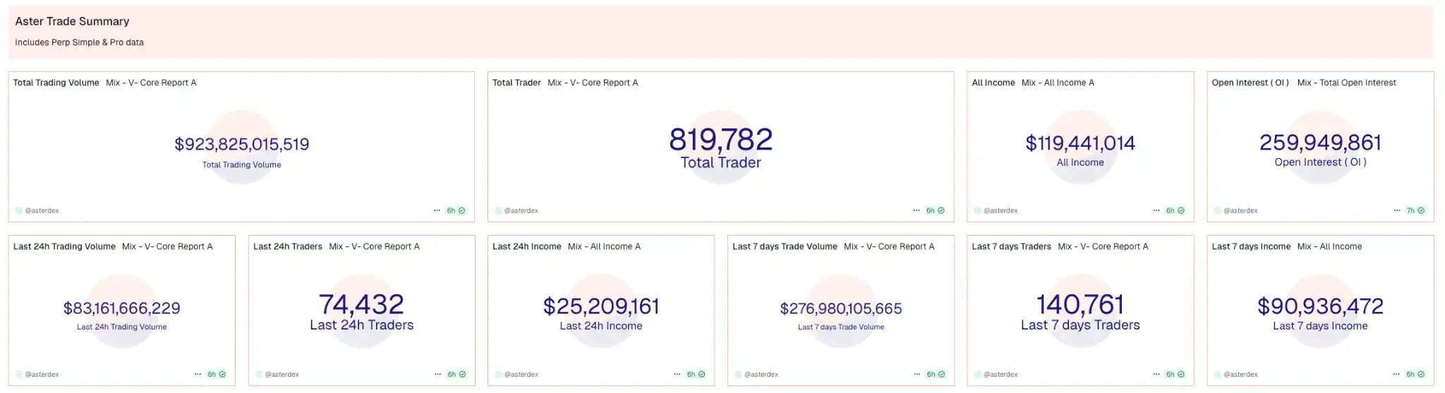 根据 Dune 上的最新数据,Aster 在多个关键指标上的增长表现相当亮眼。总锁仓价值(TVL)达到 14.67 亿美元,充分体现了项目的资金吸引力和市场认可度。更厉害的是累计交易量突破 9238 亿美元,这个数字不仅体现了平台的交易活跃程度,更反映出用户对平台的高度粘性和信任。用户规模方面,平台已经积累了 305.7 万总用户,为项目长期发展打下了坚实基础。协议累计收入 11.94 亿美元,有力证明了平台盈利模式的有效性。