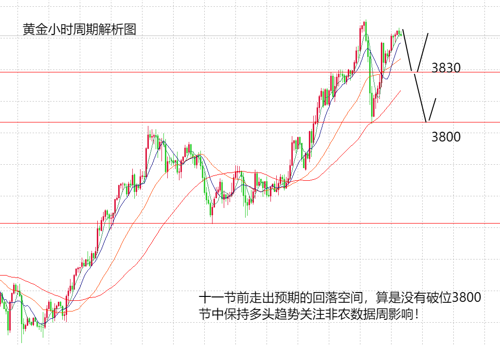 十一节前的走势跟山海预期的一样,走出了一波抛盘性的大跌空间,黄金,白银在强势中都有所调整,其中,黄金从3872跌至3793,全盘下跌79美金,白银从47.2下跌至45.7,全盘下跌1.5美金。山海强调,重点关注调整后是否有延续性,如果不能延续,多头占优,那么,在调整后会立刻走出上涨空间,所以,调整结束后还是做趋势多。因此,周二山海给出了黄金3798的多单,白银45.5支撑多单,再次抓到了趋势利润。从今天开始,关注本周非农数据周的影响,看数据行情的变化,大家注意风险控制。