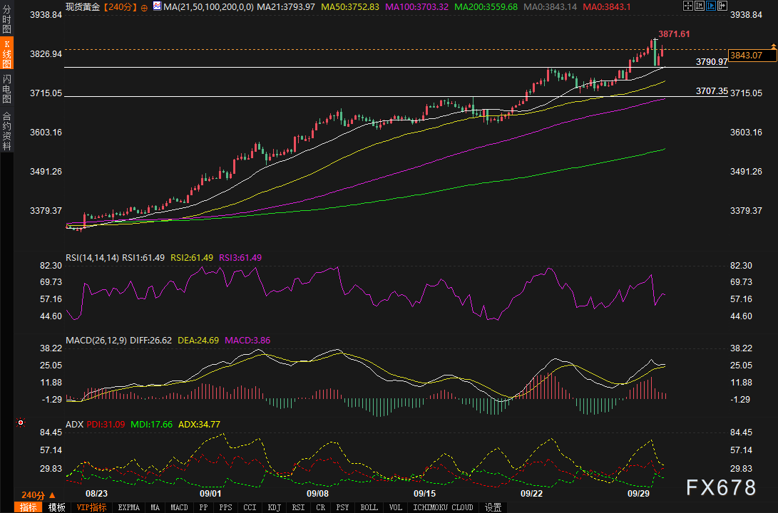 汇通财经APP讯——周二(9月30日)美盘时段,现货黄金收复部分早盘失地,盘中交投于3848美元附近。黄金从近3871美元的历史新高跌至3800美元区间后,正逐步收回涨幅,这是因为美国消费者信心数据走弱公布后,买家重新入场。