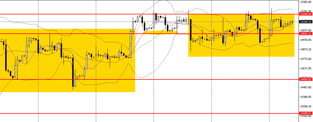 A50收十字星,仍徘徊于5日、10日均线附近,未能有效升破15200一线阻力,4小时仍未摆脱14800-15200区间内,稳健者可保持观望。