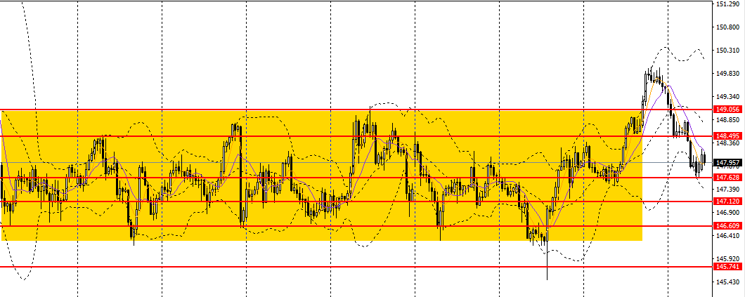美日持续阴跌,下探日线布林中轨,日线RSI跌至50左右,4小时回踩147.60附近支撑,整体趋势仍偏弱,如无法下破147.60,空单可暂时离场。