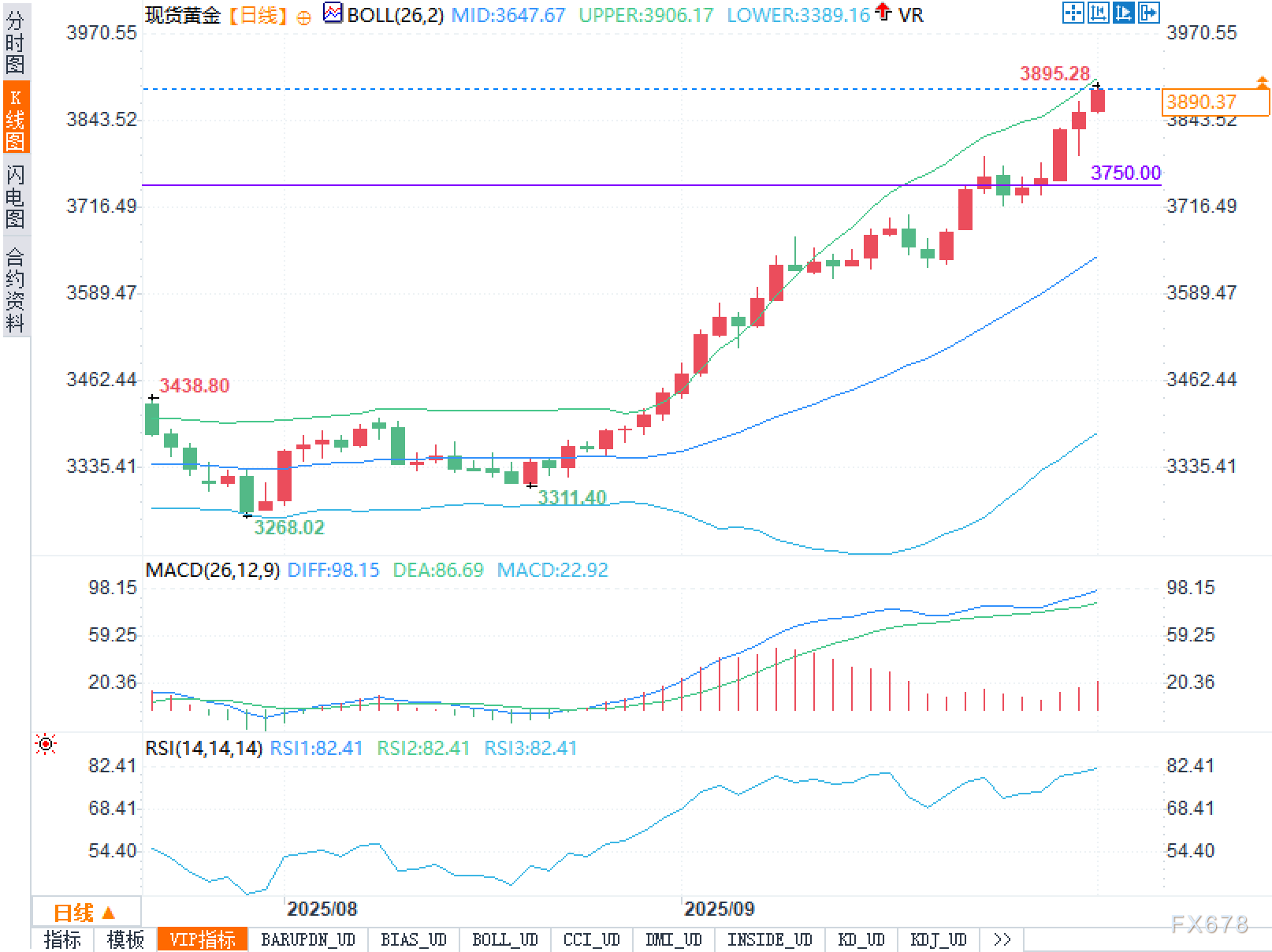 日线图显示,现货黄金自8月下旬以来沿着布林带通道上轨强势拉升,形成典型的上升通道。布林带中轨位于3647.67,上轨为3906.17,下轨为3389.16。金价目前运行在上轨附近,连续多根阳线实体放大,反映市场处于强劲的多头趋势之中。前期盘整区间的上边界约在3750美元一线,该区域突破后形成支撑,并成为短线回撤的首个关注位。若金价继续上攻,下一阻力在布林上轨3906附近甚至心理关口4000美元。需要注意的是,K线实体快速远离中轨,布林带宽度显著扩大,显示波动率急剧上升;一旦行情无法站稳,可能出现回测中轨的整理。从支撑角度看,中轨3647一线和下轨3389一线构成中期支撑,若出现回撤,观察这些价位能否提供有效承接。
