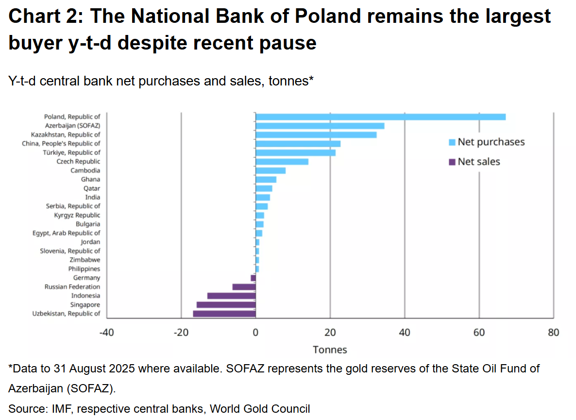 即便近期暂停,NBP 仍是 2025年全球最大黄金买家,截至8月底累计增持 67 吨,总储备升至 515 吨。