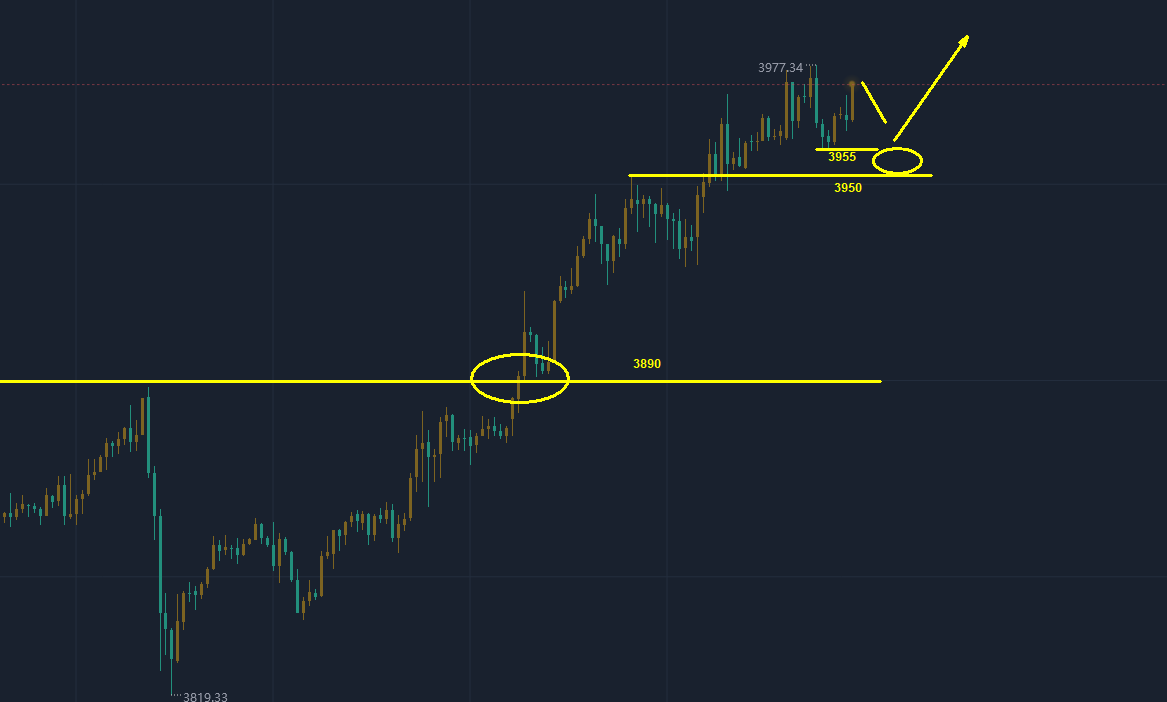 短线上,关注回踩3950-3955支撑带时择机做多,继续看上行。
