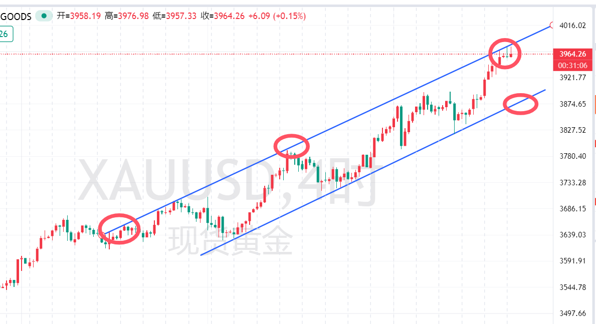 对于今天的行情来说,直接看图比较直观。眼下4小时图处于上升通道上轨位置压制,而4小时图上方出现“倒锤线”形态,说明早盘高点3977压力明显,行情继续看好回落。