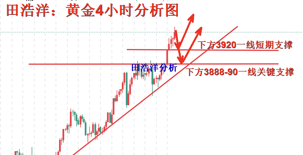从4小时行情走势来看,关注下方短期支撑关注3920一线,重点关注3888-3890一线支撑位,多头强势上涨不言顶,操作上以回踩做多为主,中间位置一律多看少动谨慎追单,耐心等待关键点位进场。具体操作策略我会在盘中提示,及时关注。