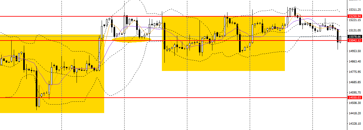 A50昨日微幅收跌,今日亚盘延续跌势,下破5日均线,4小时继续承压于15000-15200下方,短线仍未摆脱高位震荡格局,可保持观望。