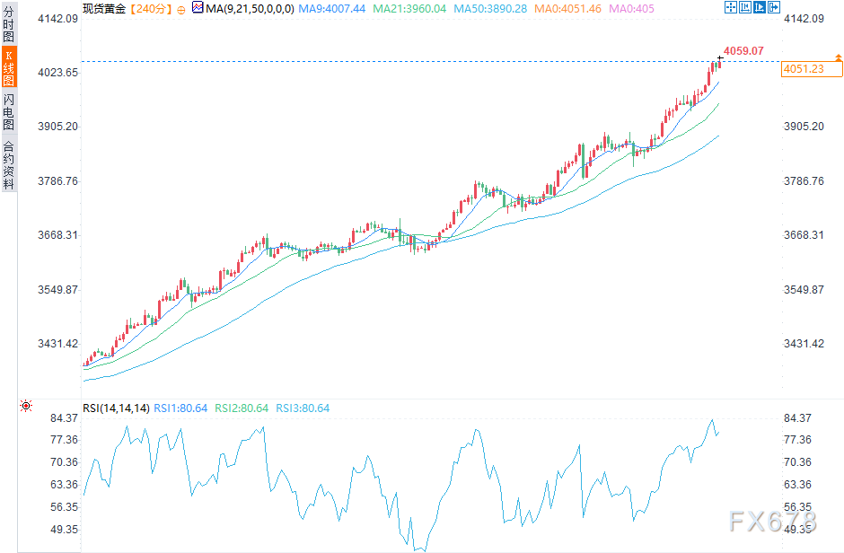尽管出现涨势过度延伸的迹象,黄金的买盘动能依然不减,延续着历史性涨势。从技术面来看,当前涨势已显拉伸,月度相对强弱指数(RSI)自20世纪80年代以来首次突破90,凸显短期过热风险。