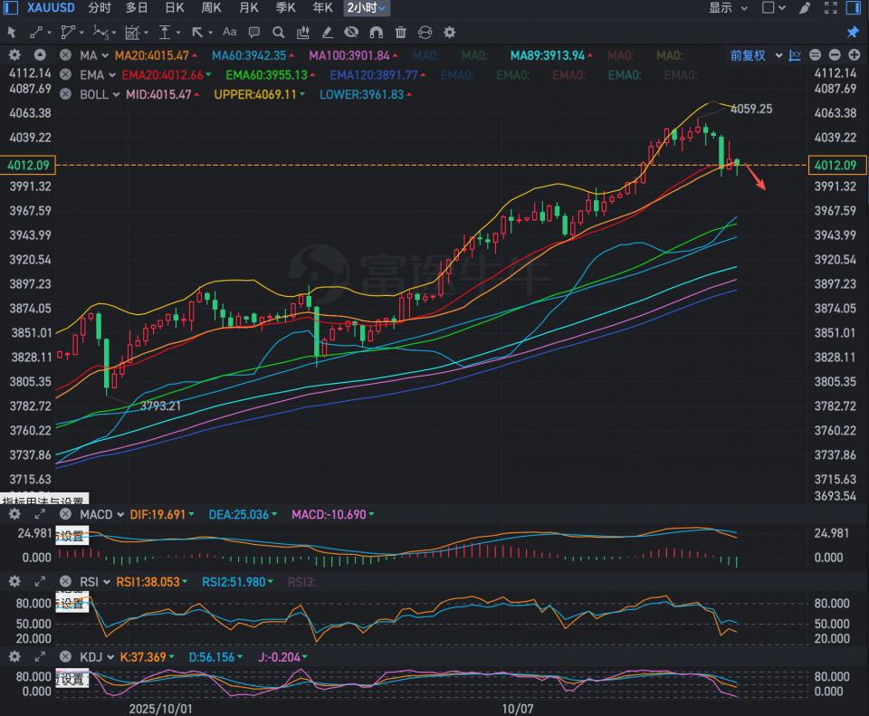 美国政府停摆一周,金价也结结实实地涨了一周,现在价格自的4059.25的高点回落,30分钟线上能看到布林带轨道的向下扩张,空头动能柱也有窄幅增量,1小时线上可以看到RSI已经完全跌下荣枯线,KDJ于负面区域的聚集还未形成反弹指引,均线系统的支撑处于4000美元下方。