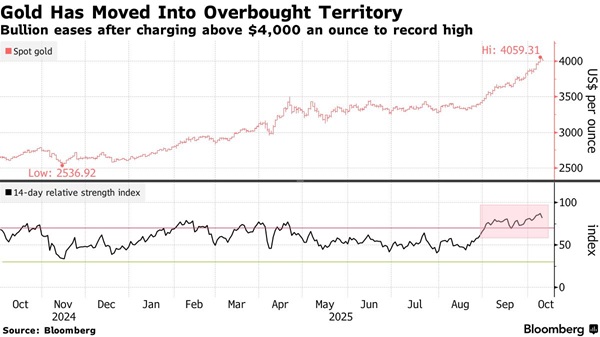 24K99讯 美国彭博社周四(10月9日)报道称,金价从周三创下的4000美元/盎司以上的纪录高位回落,此前的强劲上涨使得这种贵金属容易出现回调。