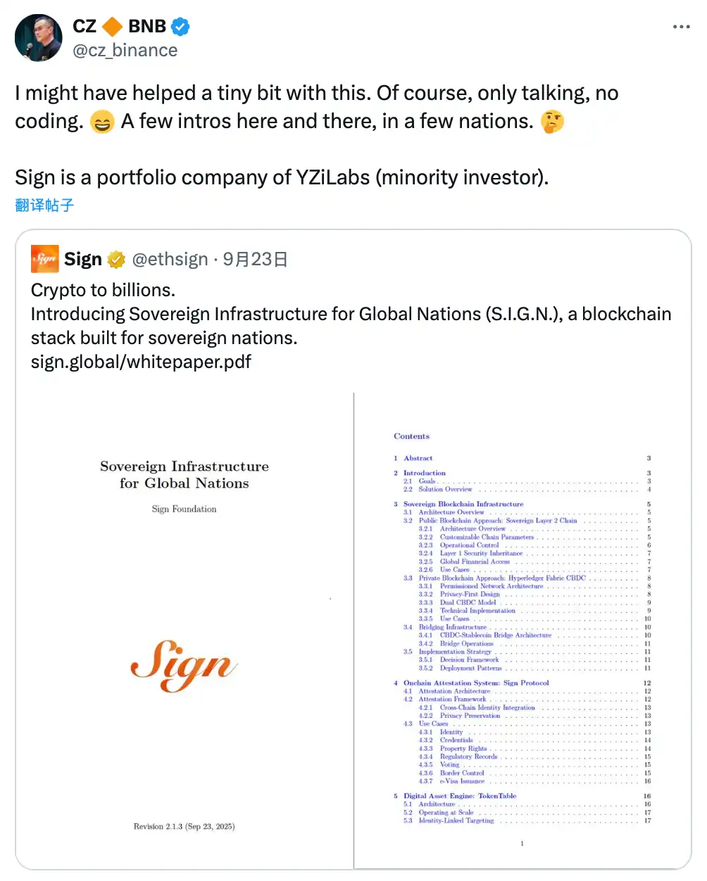 CZ牵线,Sign推出从主权链到全球结算网络的国家主权基建