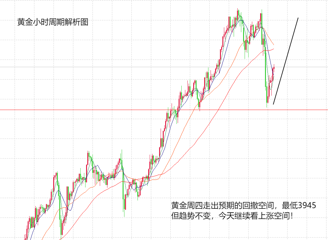 虽然上个交易日黄金走出了暴跌空间,全盘上下接近有115美金,但是山海还是要强调的是,黄金的多头趋势不变,未来市场还是要看主力上涨。在趋势中,一切下跌都只算是调整空间。不过,尊重市场,既然黄金走出了大跌,那么,今天黄金就不会像周一,周二,周三那样强势,所以,今天黄金走势有两种可能,要么是多头趋势的高位震荡,要么是单边多头上涨趋势。那么,今天交易还是尽量做低多看涨。从技术面来看,日线大阴回落,跌破5日均线,但没有破位10日均线,所以,不存在说强弱转换,下方跌破3900才可能考虑多空趋势变化。H4周期短期布林收口,可能会在高位震荡一段时间,实际上下关注的区间在3920/4060,所以,即使今天再低一波也算是正常的表现,但午夜在低位3945快速反弹,那么,今天再走低的可能性不大,大概率会在3945之上继续看涨,还是保持看涨不猜顶原则,如果继续走出趋势力度,今天还是可以看涨到前高4060高点。小周期来看,小周期下方支撑在3970附近,今天亚欧盘可在此点位做多看涨,如果是震荡大概率看到4000之上,如果是单边即可逐步看4030,4060。