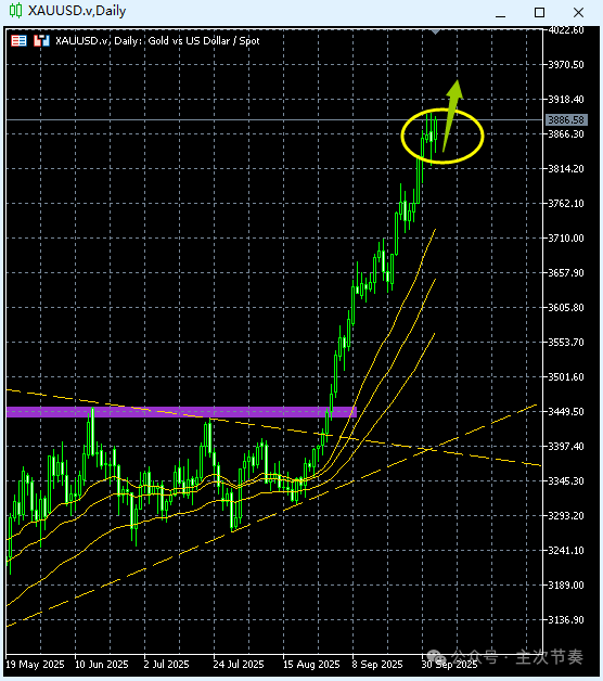 无论从哪个角度,这次黄金向上突破横盘区间,都是成功的,而且突破之后的连续性相当好。当前正处在中期单边上涨过程中。Update: 2025-9-14