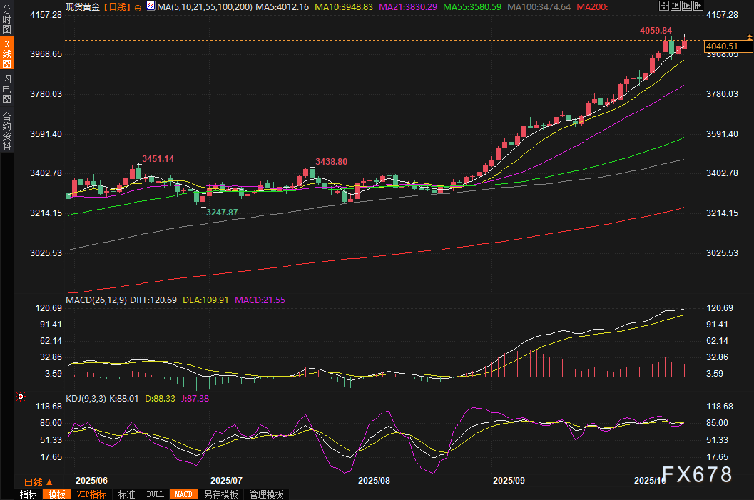 汇通财经APP讯——周一(10月13日)亚市早盘,现货黄金继续冲高,一度上涨1%,创下4059.87美元/盎司的历史新高,刷新了上周三的4059.05美元纪录,国际贸易局势紧张、地缘政治风险升级、美联储降息预期以及多国政治乱局共同作用下,黄金的避险需求居高不下。黄金作为非孳息资产,在不确定性笼罩全球市场的时刻,再次证明了其“避险之王”的地位。