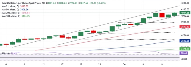 24K99讯 周一(10月13日)亚洲交易时段,现货黄金价格大幅攀升,金价刚刚触及4078.21美元/盎司,创下历史新高,日内涨幅一度超过60美元。FXStreet高级分析师Dhwani Mehta撰文,对金价技术走势进行分析。
